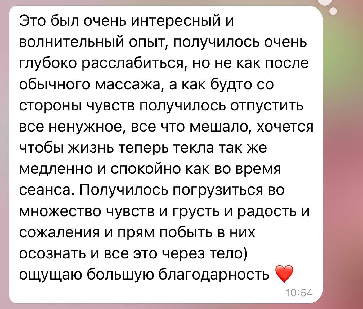 «ХОЧЕТСЯ, ЧТОБЫ ЖИЗНЬ ТЕПЕРЬ ТЕКЛА ТАКЖЕ МЕДЛЕННО И СПОКОЙНО, КАК ВО ВРЕМЯ СЕАНСА» Замедлить или успокоить темп жизни мы, конечно, не можем) но вот то, что точно в наших силах - это управление своим состоянием и снижение внутренней спешки, гонки и тревоги А отключиться от тревожных состояний и суеты помогает контакт с собственным телом.🙏 Во время ребалансинга создается тотальное погружение в момент, в чувства и ощущения 🫠 И в этом моменте мы даем телу то, что ему необходимо: 🕊свободу и легкость, потому что вы можете через дыхание, звучание, движение выгрузить то, из-за чего создается тревога, и что давно просится наружу, освободиться от лишнего груза переживаний, снять накопленное напряжение и усталость 🌟ресурс, ведь в процессе ваше тело расслабляется так глубоко, что вы получаете полноценный отдых и наполнение 🌿живость. Благодаря ребалансингу в вашем теле начинает активно протекать жизненная энергия Цель телесной терапии — оживленное тело, индивид, способный к полному выраж