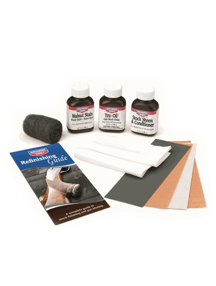 В набор «Birchwood Finish Kit» входят несколько тонкозернистых шкурок, стальная вата, салфетки, и главное - три флакона разного назначения. WalnutStain – это морилка на водной основе цвета «натуральный орех». Морилка – другими словами, средство для окрашивания, краска. Tru-Oil – собственно масло для пропитки, и Stock Sheen & Conditioner – быстросохнущее средство для финальной отделки, придающее поверхности матовый блеск, а так же защищающее пропитанный маслом слой древесины от воздействия воды и механического истирания.