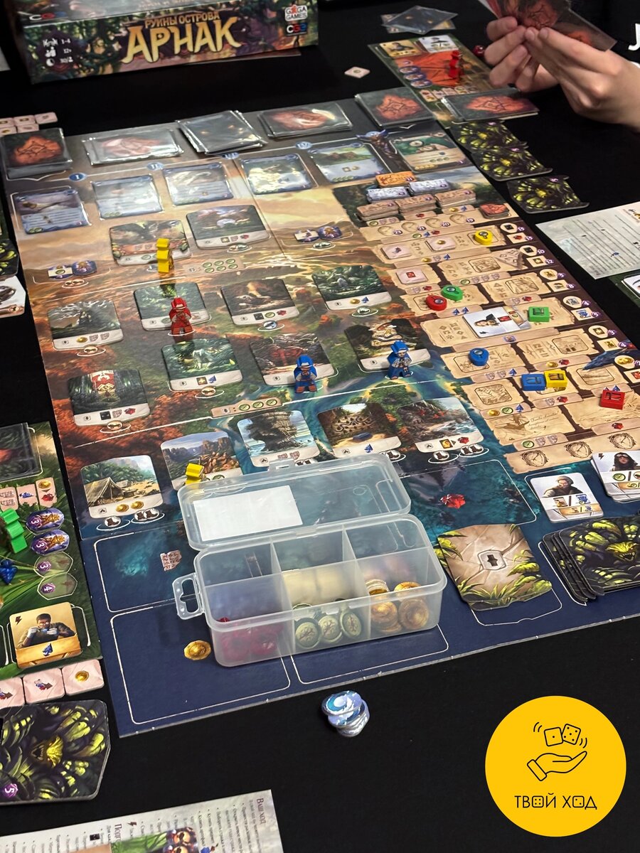 Играли, исследовали, побеждали монстров и вот что получилось! 📦 Описание игры: «Руины Острова Арнак» — это настольная игра про исследование таинственного острова, поиск артефактов и сражения с древними стражами. Вас ждёт приключение в духе Индианы Джонса — с раскопками, опасностями и древними тайнами! Игра рассчитана на 1-4 игроков, длится около 90-120 минут. Подходит как для опытных игроков, так и для тех, кто уже попробовал парочку евроигр. ⚙ Механики игры: Декбилдинг — вы собираете колоду карт, покупая новые артефакты и предметы Воркерплейсмент (выставление рабочих) — отправляете фигурки археологов исследовать новые локации Менеджмент ресурсов — правильно тратите компасы, монеты, артефакты и идолы, чтобы продвинуться дальше Исследовательская трек-система — поднимаетесь по храму, получая бонусы и очки Что круто — все эти механики переплетены плавно и логично, без перегрузки. ✅ Плюсы игры: - Красивейшее оформление и компоненты (иллюстрации реально радуют глаз). Наконечники, руби