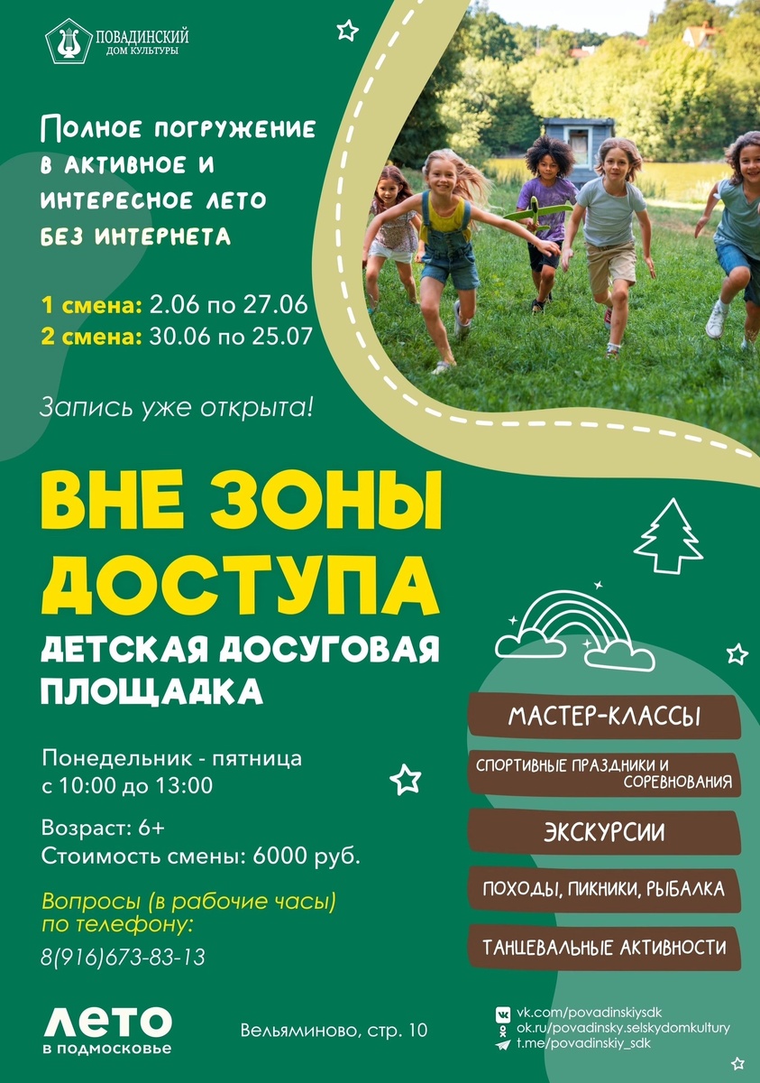✨ ☀️Не знаете чем занять ребенка летом? У нас есть прекрасное предложение. Записывайте ребенка в детскую досуговую площадку «Вне зоны доступа», в рамках которой мы подготовили: ✨Мастер-класс ✨Спортивные праздники и соревнования ✨Экскурсии ✨Походы, пикники, рыбалка ✨Танцевальные активности ☀️С понедельника по пятницу с 10:00 до 13:00 ваши дети будут свободны от телефонов и заняты интересными делами Все вопросы по телефону в рабочее время: 8(916) 673-83-13 🚫 Возраст: 6+ 🏢 Повадинский сельский дом культуры (СДК) 📍 г.о.Домодедово, с.Вельяминово, 10, Центральная площадь 💰 Цена: 6000 ₽ ✅ Мероприятия Домодедово https://dzen.ru/id/66f10385cc4c5a16f7b5fb02 http://vk.com/domodedovo_events http://dzen.ru/domodedovo_events