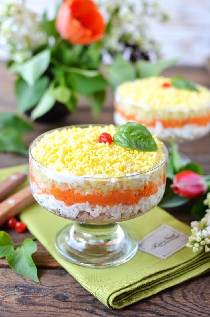 Салат "Мимоза" традиционно готовится слоями и отличается нежностью вкуса благодаря рыбному компоненту и картофельно-яичной смеси. Порционная подача делает салат привлекательным внешне и удобным для подачи на стол. Ингредиенты (примерно на 4 порции): - Консервированная рыба (сайра, горбуша или скумбрия) — 1 банка (~200 г) - Картофель вареный — 2 штуки среднего размера - Морковь вареная — 1 средняя - Яйца вареные вкрутую — 3 штуки - Майонез — по вкусу - Репчатый лук — половина средней головки - Свежий укроп — для украшения - Зелёный горошек консервированный — 1 чайная ложка на каждую порцию (по желанию) Способ приготовления: 1. Подготовка продуктов: - Варёный картофель и морковь очистите и натрите на средней тёрке. - Яйца отделите белок от желтка. Белки натрите на мелкой тёрке, желтки оставьте пока целыми. - Рыбу размять вилкой, удаляя косточки. - Лук мелко нарезать и ошпарить кипятком, чтобы убрать излишнюю горечь. 2. Сборка салата: Используйте маленькие стеклянные стаканы, креманки или