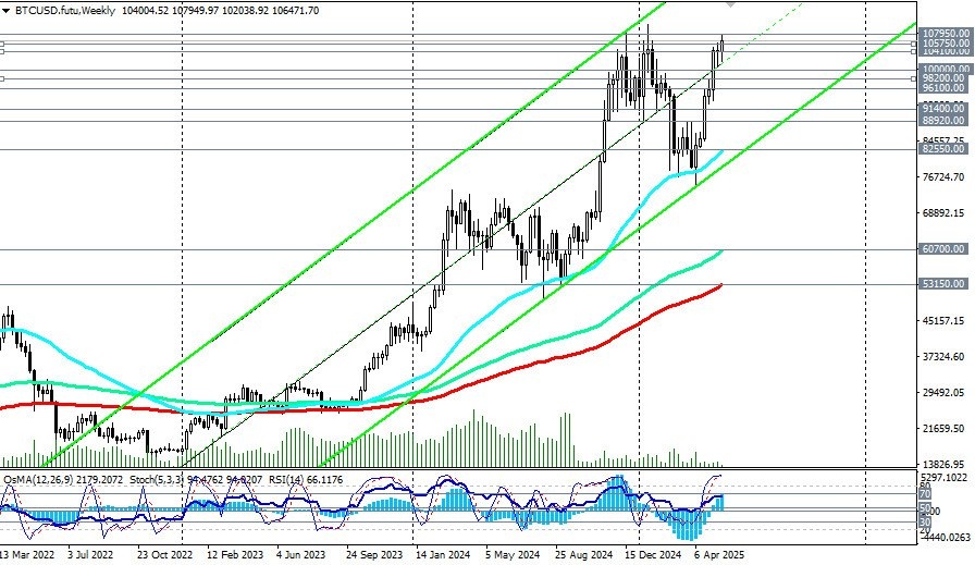 С технической же точки зрения BTC/USD продолжает развивать восходящую динамику в зоне среднесрочного и долгосрочного бычьего рынка, выше ключевых уровней поддержки 88920.00 (ЕМА200 на дневном графике), 53150.00 (ЕМА200 на недельном графике), соответственно, что сохраняет преимущество за длинными позициями. Поэтому, любая нисходящая коррекция к важным уровням поддержки может рассматриваться как повод для наращивания покупок BTC/USD.