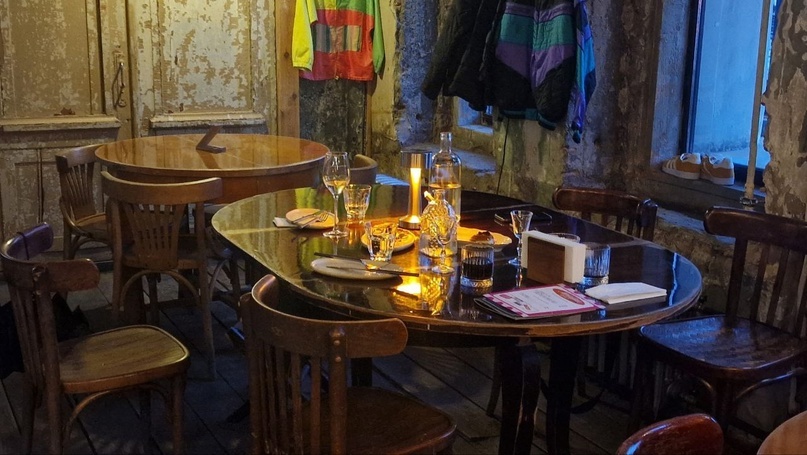 Место действия бар «Менталитет». Атмосферный, винтажный. Ободранные стены. Самобытные «украшения». Туалет — в шкафу (я, признаться, нашла его не сразу).