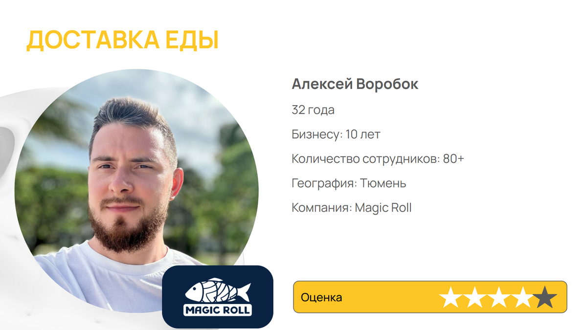 Сегодняшний герой – Алексей Воробок. За 10 лет в Тюмени и Сургуте он построил сеть доставки «Magic Roll», состоящую из 10 точек, с собственной логистикой и стабильной прибылью в сотни тысяч рублей с каждой точки. Это не просто очередная история успеха, это реальный пример того, как системный подход позволяет создать прибыльный и масштабируемый бизнес в высококонкурентной среде.