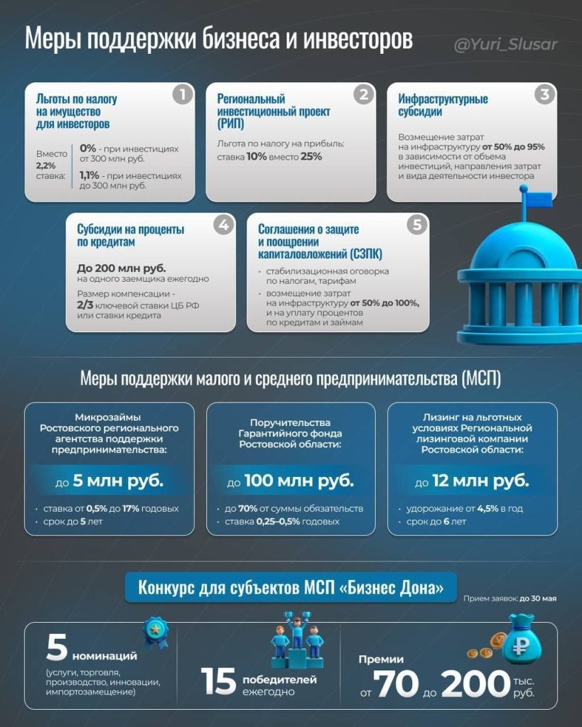 Глава Ростовской области Юрий Слюсарь рассказал в своем телеграм-канале реализации господдержки для привлечения инвесторов, а также о ее первых положительных результатах. По словам Юрия Борисовича, донской регион остается привлекательным для инвесторов, что положительно влияет на качество и объемы производства, а также на открытие новых и модернизацию действующих предприятий. В числе мер поддержки — «инфраструктурные» субсидии, средства на возмещение части затрат на уплату процентов по кредитам, налоговые льготы, предоставление земельных участков в аренду без торгов, а также защита и поощрение капиталовложений. «В 2024 году инвестиции в основной капитал выросли на 2% – это более 700 млрд рублей, а частные инвестиции – на 12% (более 500 млрд рублей). И такое поступательное движение мы продолжаем и в этом году», — сообщил Юрий Слюсарь. В марте глава посетил одно из таких предприятий. «Рускальк» в Тацинском районе, используя меры господдержки, уже завершает модернизацию своей второй фаб
