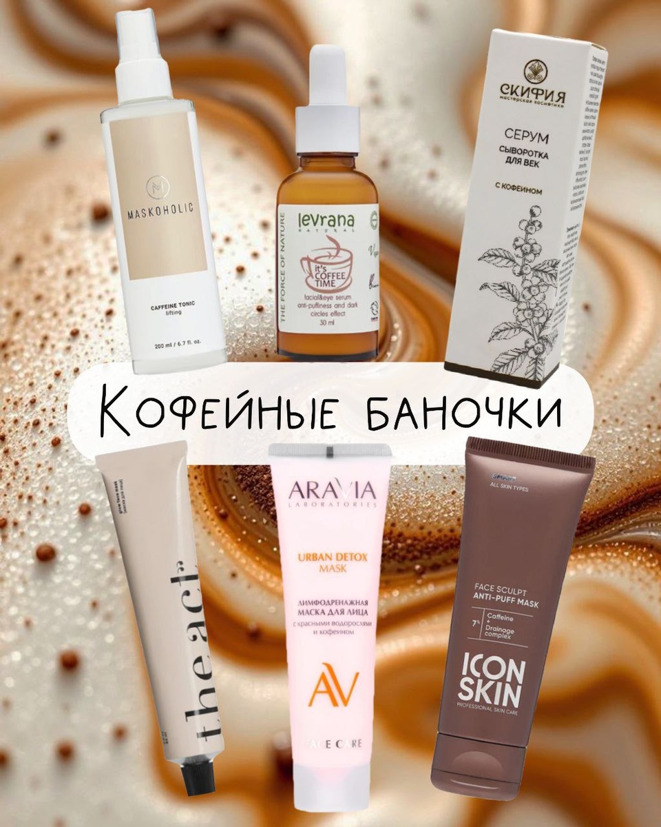 Как кофе с утренними сливками, так и кофеин в косметике нуждается в правильных «спутниках» Один кофеин хорош, а с усилителями работает в разы эффективнее: • Гиалуроновая кислота — убирает сухость, которую может дать кофеин • Витамин C — помогает осветлить и усилить тонус • Ретинол — ускоряет обновление клеток • Женьшень — разгоняет кровь и возвращает лицу энергию Поэтому смело берите крем с витамином С, а маску с кофеином. Или наоборот. Вот что уже протестировано мной: 1. Maskoholic антивозрастной тоник-спрей с кофеином и комбучей 2. Levrana сыворотка для лица с кофеином 3. Скифия гель для век с кофеином 4. The Act маска для сияния с кофеином, мягенькая 5. Aravia лимфодренажная маска с кофеином и водорослями, уже по сильнее 6. Icon Skin маска против отеков с 7% кофеина, самая мощная Добавляйте кофеёк в свою рутину и радуйтесь уходящим отёкам