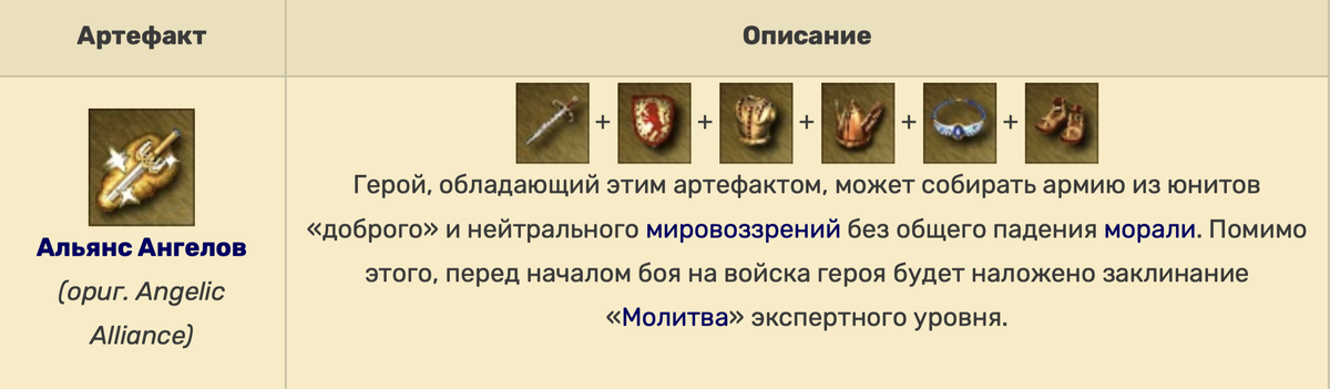 Вы ждали его? Может, и не ждали, но один из великолепных сборных артефактов Heroes 3 вернулся в Olden Era. Вообще, я заметил, что создатели вводят в оборот многие популярные сеты артефактов, помимо создания новых. Но Альянс Ангелов, безусловно, одно из знаковых сокровищ игры. Напомню, что в третьей части он собирался из шести составляющих, которые вы видите на экране: Помимо колоссального прироста к характеристикам, он позволяет собирать под своим знаменем существ доброго и нейтрального мировоззрения без падения морали, и только Инферно, Некрополис и Темница оставались не у дел. Самое главное - в начале боя на все ваши войска накладывается экспертная Молитва, поднимающая показатели атаки, защиты и скорости. После такой молитвы ваша армия точно уверует в истинного бога, даже если все были атеистами, и накинется на врага с удвоенной силой. В общем, артефакт увеличивал вашу мощь многократно, делая его желанным приобретением для любого героя. Что же у нас в Olden Era? Альянс Ангелов тоже с