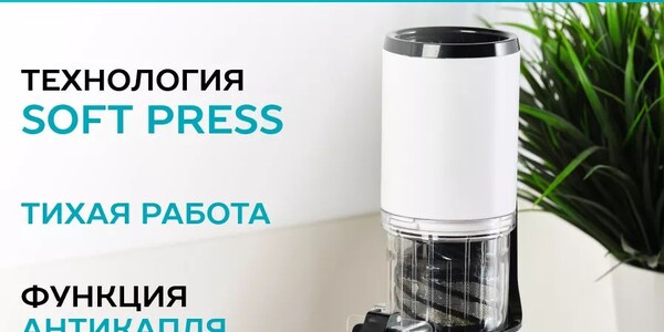 - Больше сока из меньшего количества продукта. Благодаря высокой эффективности отжима вы получаете на 20–30% больше сока, особенно из плотных или волокнистых продуктов: яблок, моркови, сельдерея, свеклы, зелени.
