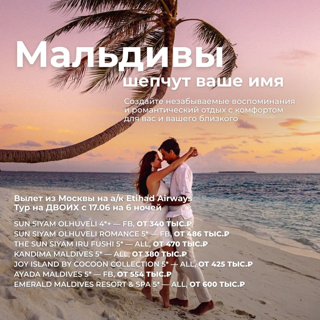 Мальдивы шепчут ваше имя — не пропустите приглашение Представьте: лазурная вода, белоснежный песок и закаты, от которых захватывает дух. Приглашаем вас на незабываемое свидание — где океан играет в любимую мелодию, а небо всеми оттенками заката. Летний сезон на Мальдивах — идеальное место для двоих 🙂 Комфортабельные номера с незабываемым видом 🙂 Ужин при свечах под звёздами 🙂 Снорклинг среди красочных кораллов 🙂 Свобода и спокойствие на сказочном острове Не откладывайте это свидание — подарите себе отпуск, который заслуживаете ✈️Вылет из Москвы на а/к Etihad Airways 📍Стоимость указана ЗА ДВОИХ с 17.06.2025—23.06.2025 Sun Siyam Olhuveli 4+* FB, 340 тыс.₽ за двоих Sun Siyam OLHUVELI ROMANCE 5* FB, 486 тыс.₽ за двоих The Sun Siyam Iru Fushi 5* ALL, 470 тыс.₽ за двоих Kandima Maldives 5* ALL, 380 тыс.₽ за двоих Joy Island By Cocoon Collection 5* ALL, 425 тыс.₽ за двои Ayada Maldives 5* FB, 554 тыс.₽ за двоих Emerald Maldives Resort & Spa 5* ALL, 600 тыс.₽ за двоих 🧡Забро