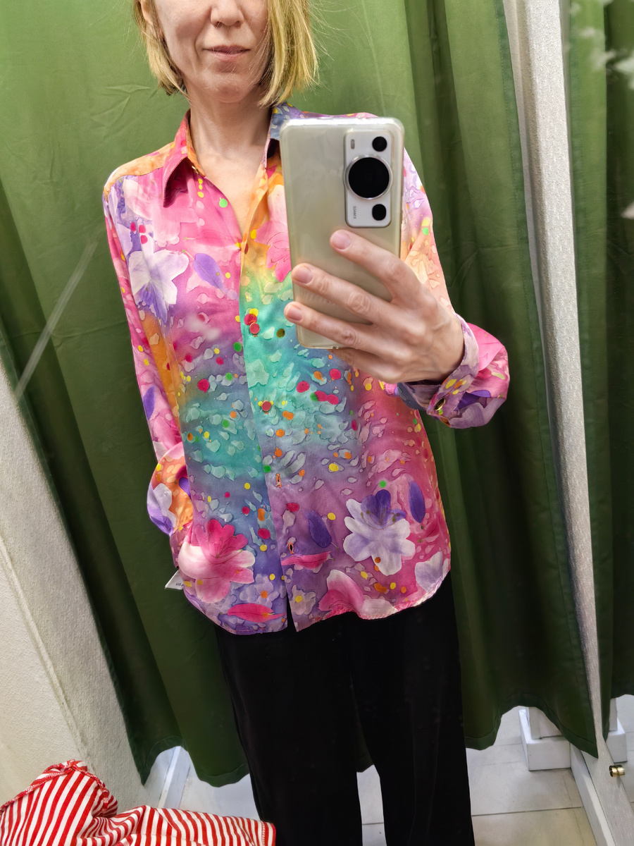 Добрый день, меня зовут Тоня и сегодня я расскажу вам о своем очень коротком, но очень удачном визите в один из комиссионных магазинов нашего города. Но прежде хочу обратиться к читателям. Друзья! Я вижу все ваши комментарии и всегда отвечаю на все, потому что мне интересно читать и общаться. Но не всегда я могу сразу ответить, хотя стараюсь. С телефона мне очень неудобно, нужно очки и т.д. Удобнее с компа, иногда поэтому откладываю на несколько часов. Поэтому, пожалуйста, не удаляйте ваши комментарии (особенно, если их было так много), если я сразу не ответила! Мне теперь очень любопытно, что там было, а я не успела прочесть и ответить)) Давайте начнем. У меня было буквально 30 минут, но за это время я нашла несколько интересных вещей, 2 из которых купила. Смотрим! Итак, я забежала на 30 минут, поэтому пошла смотреть блузки, решила, что посмотрю только их. И сразу нашла блузку, которая ввергла меня в задумчивость) Это точно шёлк, более того, бирка на этой блузке точно оригинальная бир