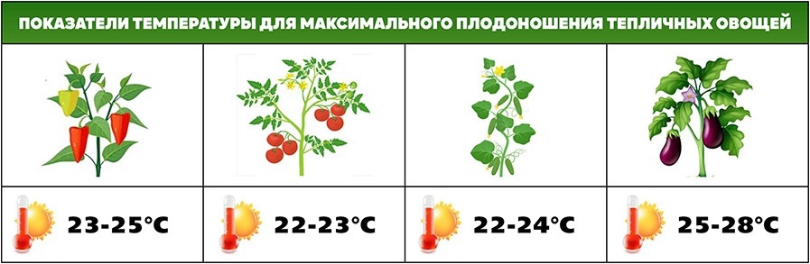 Томаты хуже переносят аномальную жару, а потому за градусником в теплице необходимо следить особенно тщательно. Диапазон температуры, при которой помидоры развиваются и пл