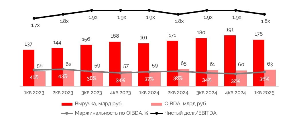 📱 МТС: дивы за счет роста экосистемы или все же долга? Вчера новость о дивах с доходностью более 16%, сегодня отчет за I кв. 2025 г. Точно повод глянуть, как обстоят дела у бизнеса (и что там с долгом), и оценить, стоит ли покупать эти акции. 🟠Первый момент — операционные результаты: — МТС укрепляет лидерство в телеком-секторе: абонентская база в России +1,4 млн клиентов (до 82,7 млн). — МТС Adtech (маркетинговая платформа) прибавила в выручке 45%, а МТС Юрент (кикшеринг) — 134%. — Количество экосистемных клиентов превысило 16,9 млн. Это на 15% больше, чем годом ранее. 🟠Как обстоят дела с финансовыми результатами (г/г): — Консолидированная выручка выросла на 8,8% — до 175,5 млрд руб. Себестоимость выросла опережающими темпами — на 16%. OIBDA увеличилась на 7,1%. — Финансовые расходы выросли на 66% и достигли 34,5 млрд руб. (больше половины OIBDA). Чистый долг компании снизился до 456,4 млрд руб. ND/OIBDA (LTM) уменьшилось до 1,8х (с 1,9х). ☝️ Финансовый директор МТС заявлял, что