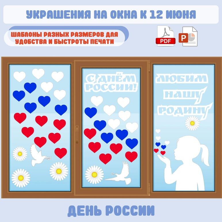 Украшение окон ко Дню России из белой бумаги. Подходит для оформления окон к Всероссийской акции «Окна России» в школах, детских садах, квартирах. Шаблоны универсальные. Для примера представлено два варианта украшения окон. Однако вы самостоятельно сможете придумать свою композицию на окне, так как материал содержит достаточное количество различных трафаретов для реализации любых идей. В набор для оформления входят: надписи ("12 июня", "С Днем России!", "Любим нашу Родину"), голуби, шарики, сердечки, девочка, ромашки. Вырезаются шаблоны по контуру. Внутри необходимо вырезать только те части, которые выделены серым цветом с помощью маникюрных ножниц или канцелярского ножа. Шаблоны представлены в формате А4, а также некоторые элементы продублированы в формате А3 для удобства и быстроты печати. Все элементы в формате png, поэтому вы самостоятельно сможете настроить необходимы вариант печати.