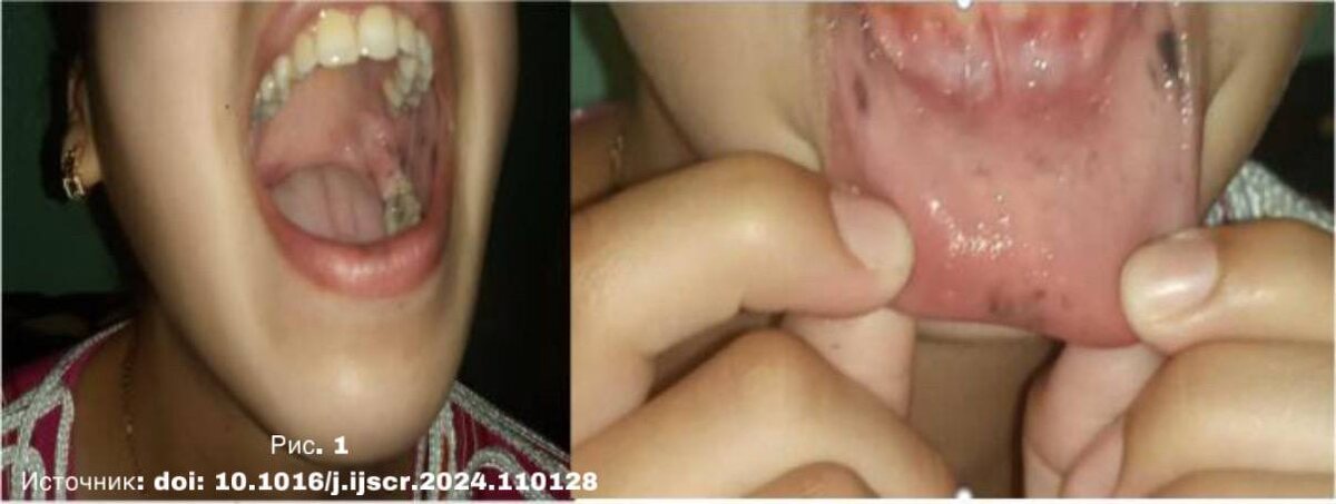 🧬Синдром Пейтца-Егерса 1921 год - голландский врач Ян Пейтц впервые задокументировал случай семейного полипоза желудочно-кишечного тракта и отличительной пигментацией кожи и слизистых оболочек 1949 год - американский врач Гарольд Джозеф Йегерс предоставил исчерпывающее описание пациентов с полипозом кишечника и аномальной пигментацией кожи ✅Таким образом, название синдрома образовано из фамилий 2 учёных Клинический случай 🔵Пациентка, 18 лет. Обратилась в приемное отделение с жалобами на: острую боль в животе, рвоту. Указанные жалобы беспокоили в течение 3 дней. 🔵Во время осмотра обнаружена множественные пигментации на лице и губах (см. рис. 1) 🔵При пальпации живота диффузная болезненность 🔵Данные ректального исследования: пустая ампула прямой кишки, без прожилок крови и мелены. Температура тела на момент осмотра в пределах нормы 🔵Анамнез: анемия в течение 7 лет 🔵ОАК, биохимический анализ крови, коагулограмма - в пределах нормы 🔵Онкомаркеры ACE, CA19-9, СА-125 - в преде