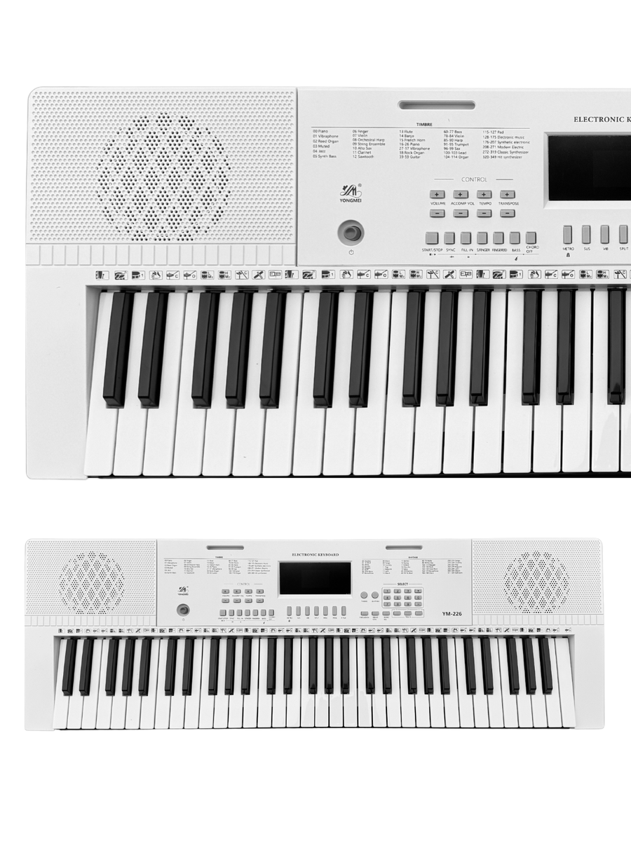 Хотите научиться играть на клавишах или ищете отличный инструмент для ребёнка? В данной статье мы расскажем о двух популярных моделях синтезаторов Yongmei, с помощью которых ваши музыкальные фантазии без труда воплотятся в реальность. Yongmei YM-226 – синтезатор, который вдохновляет Это универсальный синтезатор для обучения и творчества. Он идеально подойдёт для: Yongmei YM-226 сочетает в себе функциональность, удобство и доступность, делая обучение увлекательным, а творчество – безграничным. Данная модель имеет богатый звуковой арсенал. С 350 тембрами и 350 ритмами вы сможете экспериментировать с разными стилями – от классики до электронной музыки. Эффекты сустейна и вибрато позволяют добавить выразительности звучанию. Функция транспонирования помогает изменять тональность на лету. А использование метронома поддерживает заданный ритм во время игры любого музыкального произведения. Встроенная система трёхэтапного обучения («послушай – повтори – сыграй сам») делает процесс интерактивным