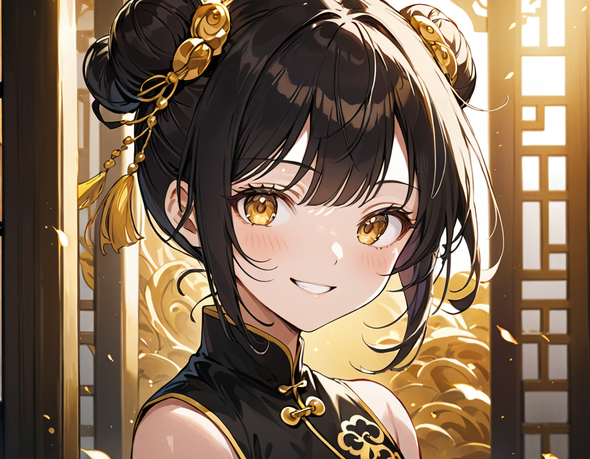 В выборке ранее, я выделил какие-то моменты, которые мне приглянулись и уточнил уже существующий промпт: "Girl, kung fu, dark hair, two buns, golden eyes, black kung fu clothing with gold elements, black short shorts". На изображениях ниже видно, что уже есть некоторые достойные работы.