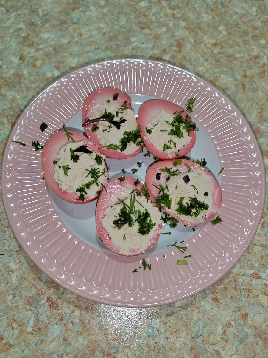 Всем приветик! 🌹🤗 Давно этот рецепт был у меня в голове, и наконец-то решила приготовить. Отварить яйца 10 минут, после достать и остудить. В эту же воду где варились яйца добавить сырую свёклу. Добавть 1 ст.л. уксуса 9% и варить 5-7 минут. Яйца очистить положить в банку и влить сок свеклы. Оставить в маринаде на 8-10 часов. Вот такие красавчики получились! Я фаршировала из желтков, кефира 1% и сыр president. Приятного аппетита!!! Желаю всем хорошего вечера! 🌄