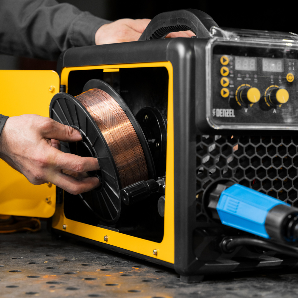 Полуавтоматы серии Denzel Mini MIG легко переносить с объекта на объект, ведь они легкие и не занимают много места, а также оснащены ручкой для транспортировки.