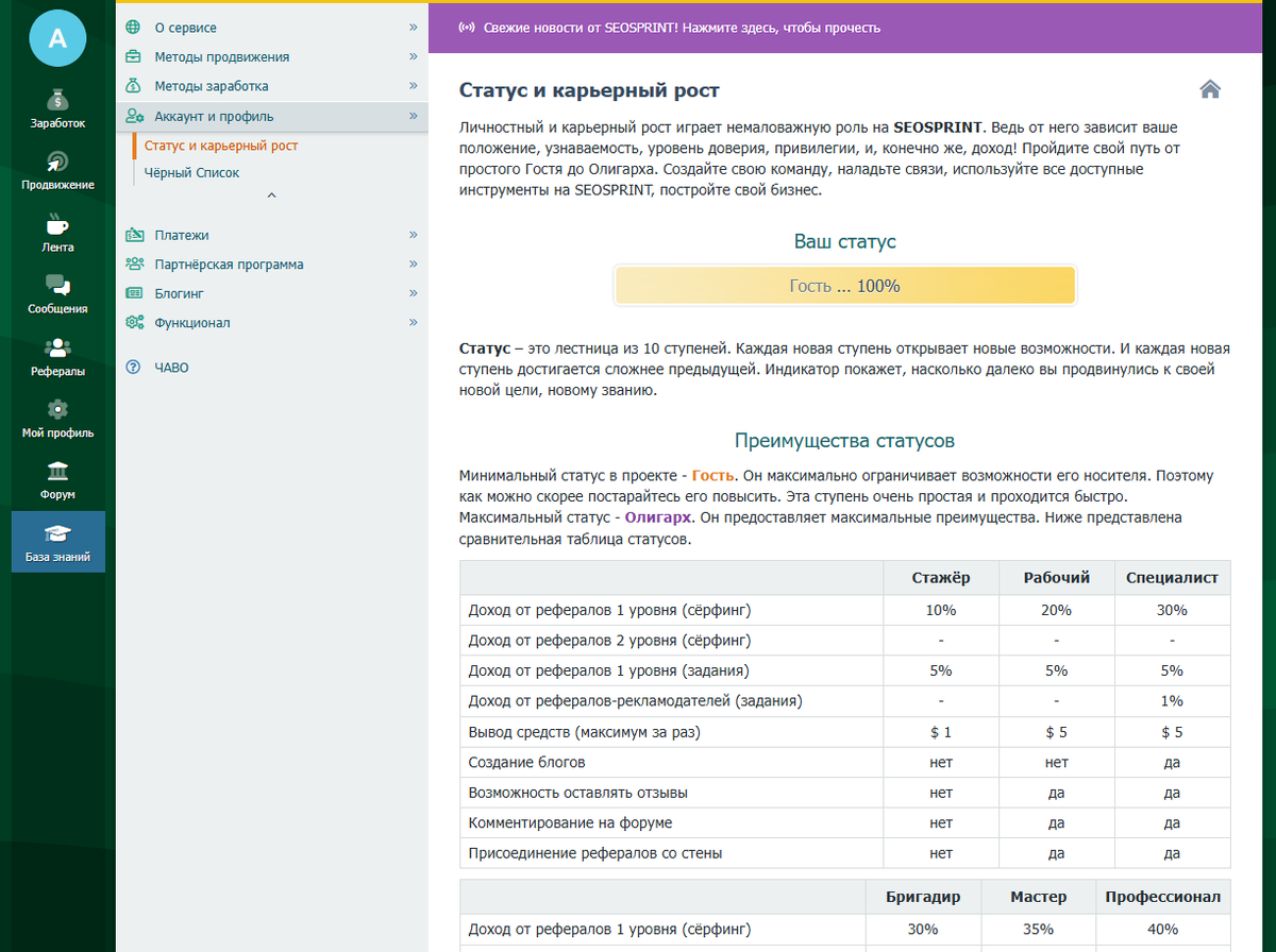 - Реферальная система: Приглашайте друзей по своей ссылке (например, https://seosprint.net/?ref=16941605), и получайте процент от их дохода или затрат на рекламу. Это отличный способ пассивного заработка.