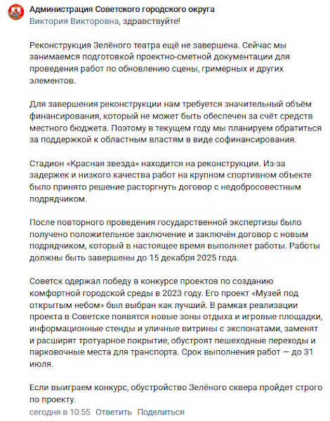 Реконструкция стадиона «Красная звезда» в Советске должна быть завершена до 15 декабря 2025 года. Об этом сообщили представители администрации муниципалитета в комментариях на странице губернатора Калининградской области Алексея Беспрозванных в соцсети «ВКонтакте». На состояние стадиона в числе прочих объектов в Советске пожаловалась посетительница страницы. «В Советске на сегодняшний день печаль: Зелёный театр развалили и не достроили, стадион „Красная звезда“ — та же история, „Музей под открытым небом“ не вызывает радости, а теперь ещё „Зелёный сквер“, который так и останется красивым на бумаге и в докладах», — написала она. «Стадион „Красная звезда“ находится на реконструкции. Из-за задержек и низкого качества работ на крупном спортивном объекте было принято решение расторгнуть договор с недобросовестным подрядчиком. После повторного проведения государственной экспертизы было получено положительное заключение и заключён договор с новым подрядчиком, который в настоящее время выполняе