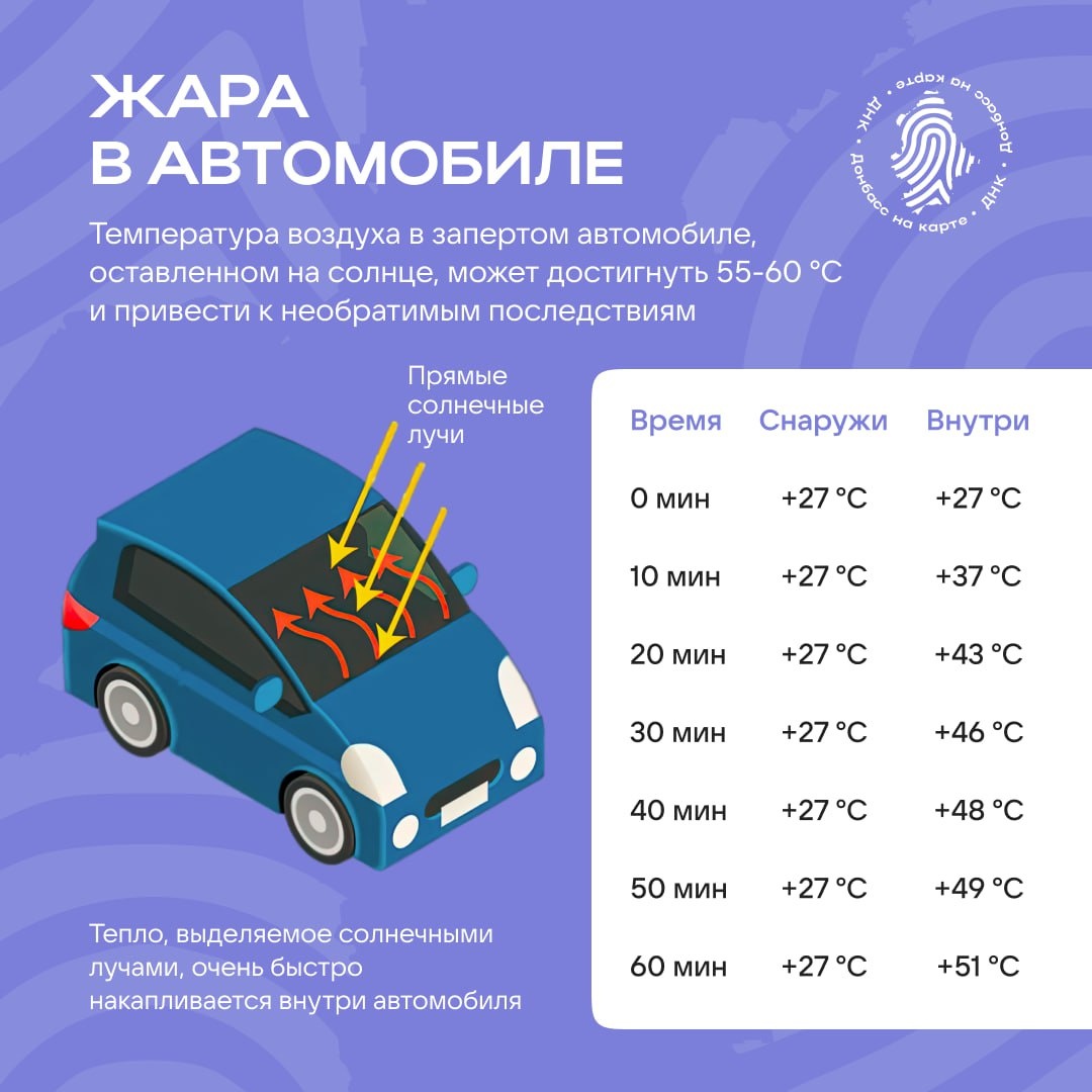 В эти выходные уже будет жарко 🌞 Пора вспомнить главное правило: детей и животных ни в коем случае нельзя оставлять в машине! Сами посмотрите, как сильно нагревается салон. А еще важно позаботиться об авто, потому что в жару и ему будет несколько не по себе 😺 Главное — в наших карточках. Подписаться | Донбасс на карте