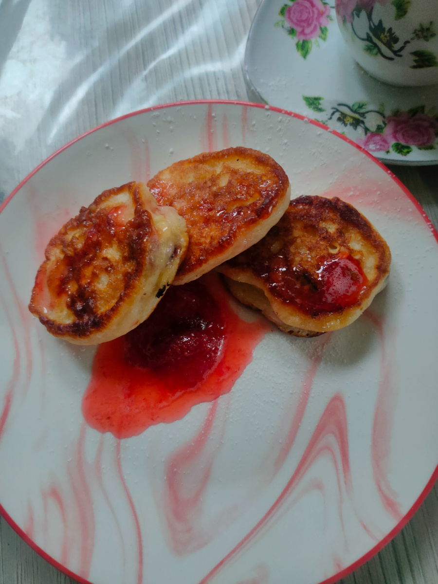 На завтрак сегодня были оладушки, которые я пекла еще в выходные, ели их с клубничным вареньем.