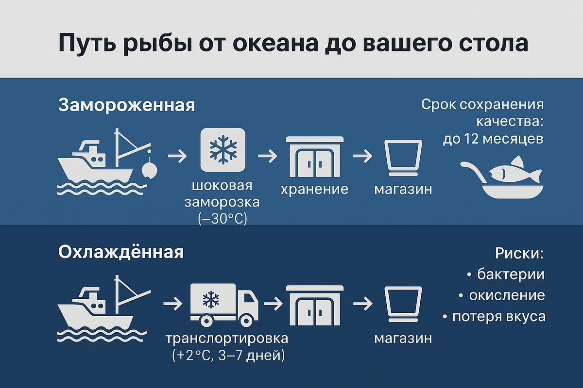 Рыба, которую везут охлаждённой, может провести в пути до 7 дней. За это время: 🔹 Пример из реальности: