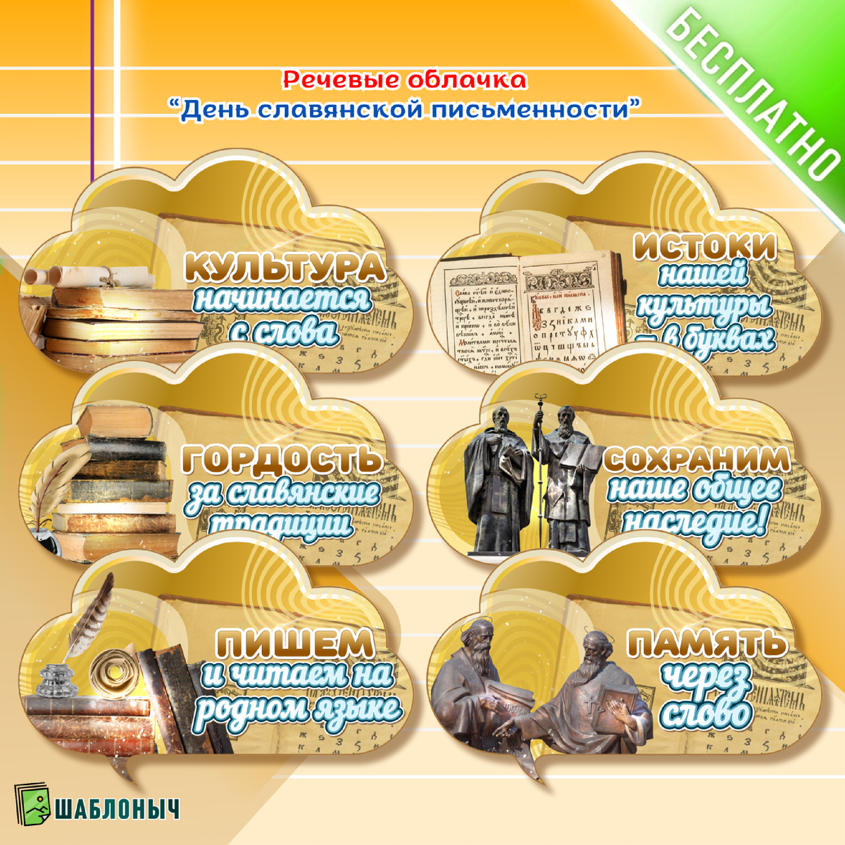 Отметьте День славянской письменности и культуры! Скачайте БЕСПЛАТНЫЕ материалы для тематического оформления! Приглашаем учителей и всех, кто интересуется историей и культурой славянских народов, отметить День славянской письменности и культуры! Этот день - прекрасная возможность поговорить о роли Кирилла и Мефодия в создании славянской азбуки, о значении письменности для развития культуры и образования. Мы подготовили БЕСПЛАТНЫЙ набор материалов, который поможет вам создать атмосферу уважения к истории и культуре славянских народов: • Материалы для оформления класса или актового зала или доски в стиле, отражающем славянскую культуру и историю письменности. • Речевые облачка с цитатами о языке, письменности, значении культуры и образования, а также с высказываниями Кирилла и Мефодия. Оставьте свой адрес электронной почты в комментариях в нашей группе, и мы отправим вам БЕСПЛАТНЫЕ материалы, чтобы ваше мероприятие, посвященное Дню славянской письменности и культуры, прошло ярко и за