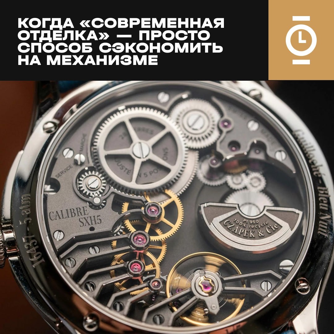 Сегодня всё чаще можно увидеть часы с так называемой «минималистичной» или «современной» отделкой механизма — простой сатинировкой или матированием. Это подаётся как дизайнерский выбор, хотя на деле речь идёт об элементарном отсутствии декора. Хотя машинная отделка стала очень качественной, оправдывает ли это её использование в дорогих часах? Нет.