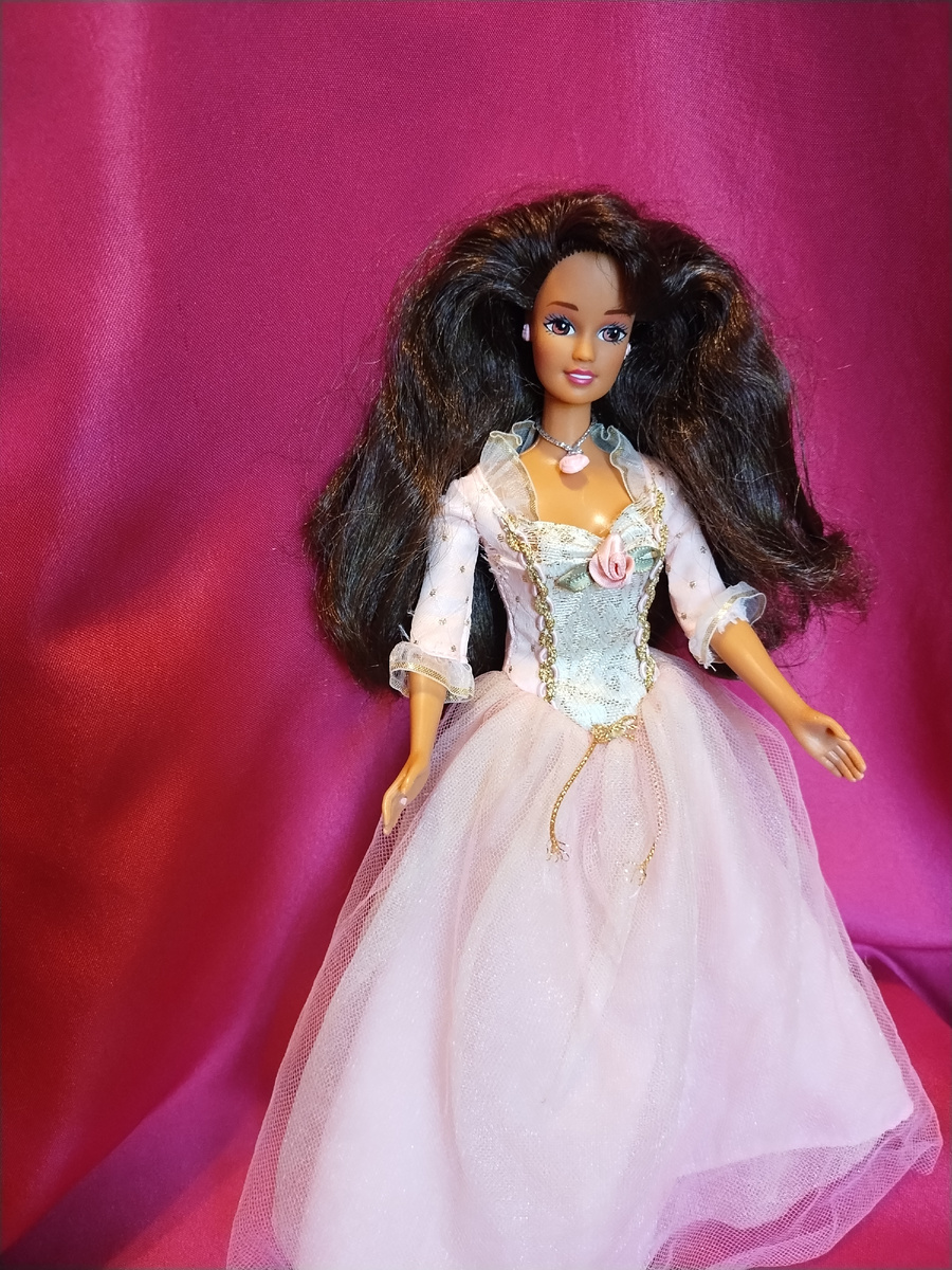 Всем доброго дня! И снова мои Барби спешат показать себя миру во всей красе. Есть у меня одна очень нежная красавица, я назвала ее: Барби - Чайная Роза. Это кукла- на Молде Тереза, шатенка с большой пышной копной волос. Пришла она ко мне без упаковки - но в этом прекрасном светло-розовом шифоновом платье в стиле модниц 19 века ( мое любимое время) Корсаж, высокий лиф, открытая зона декольте - все это подчеркивает фигуру и тонкую талию. У этой Барби очевидно образ Розы. Видимо изначально так и было, просто я не могу найти ее оригинальную картинку Аксессуар розы присутствует во всем: платье выполнено как будто из лепестков роз, ожерелье украшено розой, сережки и даже колечко тоже в виде розовой розы. Макияж Барби тоже нежный, розовых тонах И она оказалась очень фотогеничной и удобной для съёмок, несмотря на свое нешарнирное тело. Поэтому фотографий я сделала много, в разных ракурсах и видах. Итак, вначале Барби Чайная Роза в студии Здесь она показывает сережки и колечко в виде