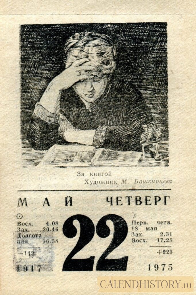 Итак, сегодня 22-го мая и у нас на календаре 1975-й год. Перед нами листок советского календаря для женщин. На календаре у нас четверг - 22 мая 1975-го года. За книгой