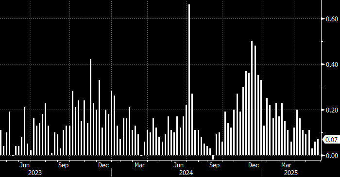 По оценке Минэкономразвития, рост показателя замедлился до 9,9% в годовом выражении с 10% неделей ранее. Потребительская инфляция в России в базисе неделя к неделе На неделе до 19 мая потребительская инфляция в России ускорилась до 0,07% н/н с 0,06% н/н, сообщает Росстат. С начала года накопленный показатель составил 3,27%. По оценке Минэкономразвития, рост показателя замедлился до 9,9% в годовом выражении с 10% неделей ранее. «За период с 13 по 19 мая 2025 г. цены изменились: на мясо кур +1,3%, сосиски, сардельки +0,5%, говядину, колбасы вареные, рыбу мороженую, маргарин, консервы овощные для детского питания, печенье, макаронные изделия и обеды в столовой, кафе, закусочной (кроме столовой в организации) +0,3%, баранину, свинину, колбасы полукопченые и варено-копченые, консервы фруктово-ягодные для детского питания, хлеб, чай черный и водку +0,2%, молоко ультрапастеризованное, смеси сухие молочные для детского питания, сыры твердые, полутвердые и мягкие, вермишель, соль поваренную +0,