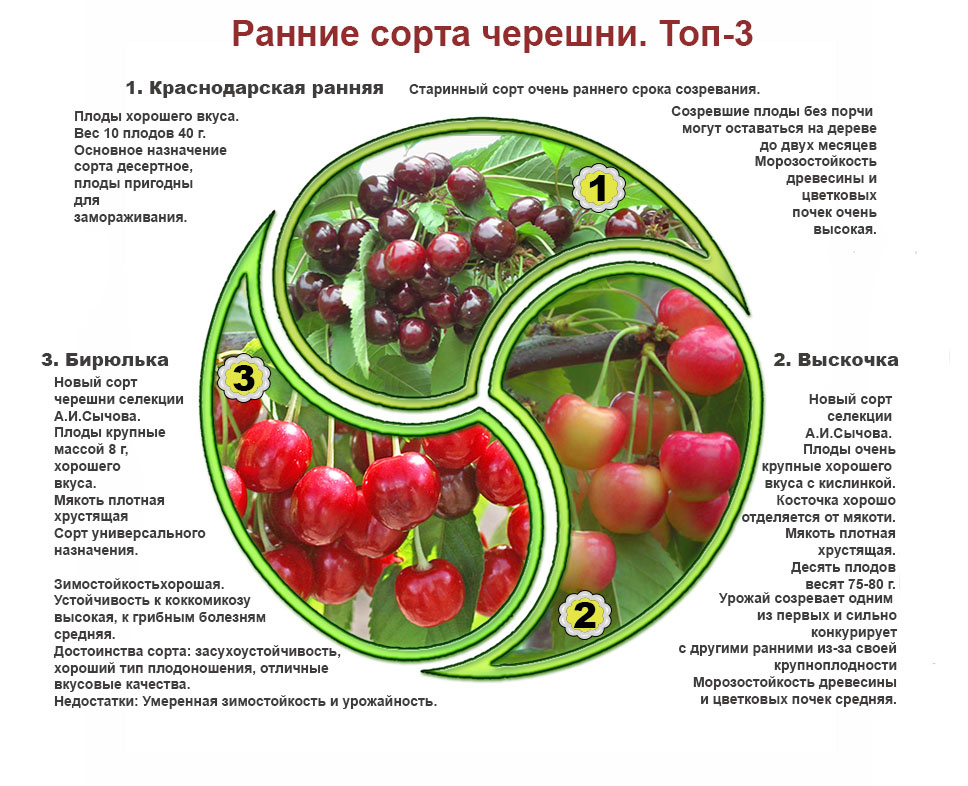 Лучшие ранние сорта черешни из коллекции ООО "Агрофирмы "Росток". Краснодарская ранняя созревает в Белгородской области с 6-8 июня и без потерь качества ее плоды могут сохраняться на дереве до двух месяцев. Выскочка и бирюлька созревают дней на пять позже и плоды их на дереве сохраняются дней 7-9.
