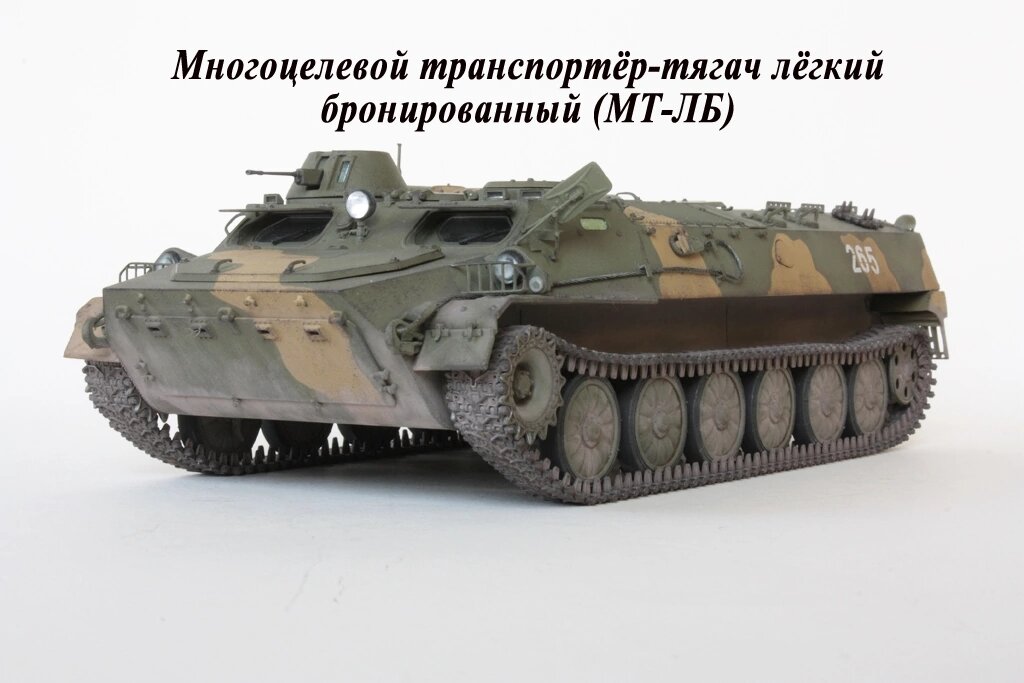 Предлагаю вашему вниманию модель МТ-ЛБ от Трумпетера №05578. Масштаб 1:35. Модель мне подарили, но на литниках отсутствовала коробка передач, баллоны и всё, что находится в трансмиссионном отделении. Пришлось всё изучать по фотографиям и самостоятельно изготавливать. Что ещё сделано: Изготовил кормовые решётки из модельного пластика, потому что с травлёными из набора справиться очень трудно. Изготовил рукоять переключения передач и кулису, проводка к фаре и звуковому сигналу, отражатель в фару, оптика, сточил ограждение фар, из веточки изготовил бревно и крепёж к нему, свил тросики, в десантном отделении на пол изготовил резиновые рифленые коврики. Выбрал схему покраски, предложенную производителем модели. Красил красками и лаками от Тамии и Mr.Hobby, пачкал продукцией МИГ и WILDER. Автор: Александр Александр ================================