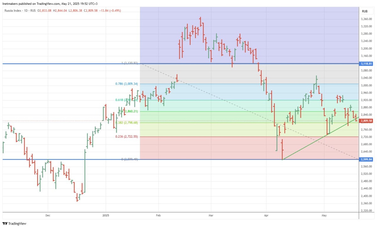 ❗️21 мая на российском фондовом рынке продолжилось снижение, индекс МосБиржи подешевел на 0,49% до уровня 2809,58. Сегодня рынок вновь демонстрировал слабость, на этот раз причиной волнений наших пугливых инвесторов стало ожидание информации по дивидендам Газпрома за 2024, которая так и не пришла. В других акциях ситуация была более или менее положительной, но и они к вечеру сдали позиции, видимо тоже чего-то опасаясь. Российский рынок очевидно ждет всего и сразу, после чего он покажет несколько процентов роста, а потом опять начнет падать. Таковы медвежьи рынки, особенно зацикленные на информации, пока так и до границы еще далеко (см.график). 👉 Наш российский 🇷🇺 портфель — индекс FTinvest.ru отступил на 0,73% и достиг уровня 788,4454, зарабатывайте вместе нашим индексом FTinvest.ru с услугой автоследования. Курс доллара США по данным ЦБ РФ сегодня снизился на 0,69% и составил 79,7530 руб. Нефть WTI ниже на 0,40% до $61,78 за баррель, а Brent на 0,43% и стоит $65,10. Золото с