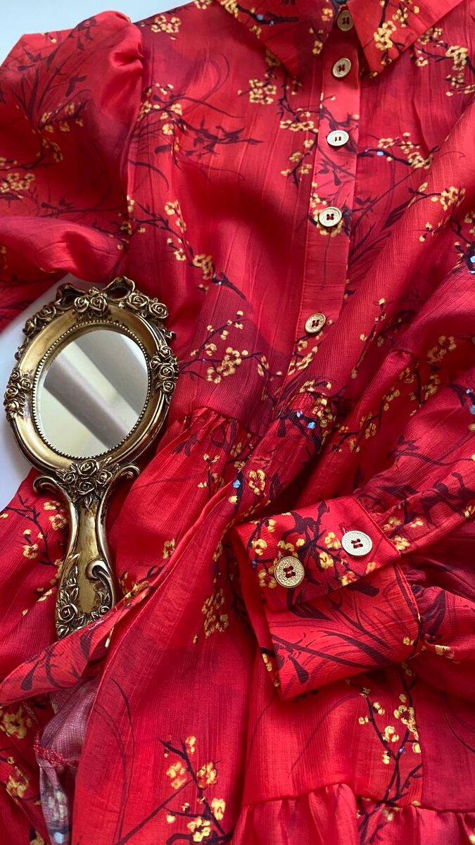 Сакура на красном - один из самых богатых дизайнов, ткань чуть более легкая, чем в карамельной версии, платье струящееся, комфортное и при