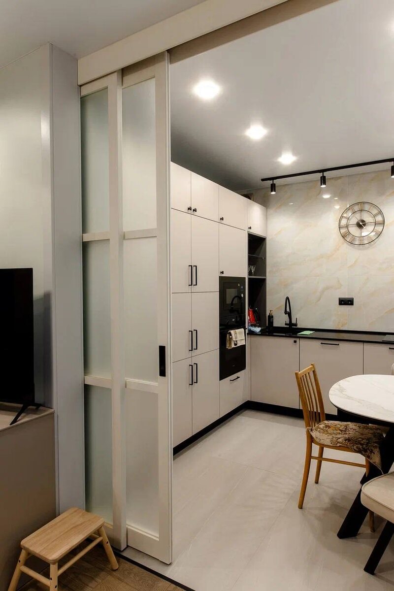 Жила раздвижная перегородка — лёгкая, почти невесомая, скользящая между гостиной и ☕️ кухней, как танцор на сцене.