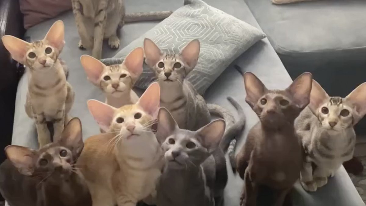 Подопечные Татьяны исполнили для нее композицию под названием «Трели воробьев». Целый хор из 9 ушастых котов чирикал, пока хозяйка «дирижировала» за кадром с помощью игрушки.