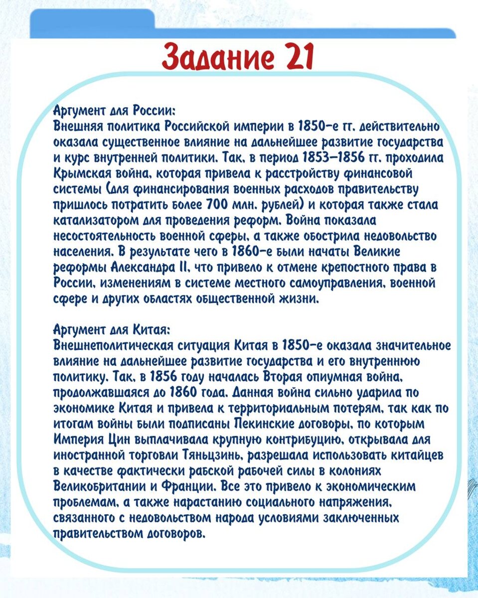 🔔🔔🔔🔔🔔Если вы нацелены на высокий результат, обязательно нужно повторить материал по Всемирной истории! Обратите внимание на задания 💚💚, связанные нетипичными странами ( Китаем, Индией, странами Латинской Америкой!)! Разберем одно задание по Китаю: Задание 21: В 1850-е гг. и для Российской империи, и для Китая сложилась достаточно сложная внешнеполитическая ситуация. Используя исторические знания, приведите аргументы в подтверждение точки зрения, что сложная внешняя политика обоих государств оказала значительное влияние на развитие государств и дальнейшую внутреннюю политику правительств в странах, где они произошли: один аргумент для России и один для Китая. При изложении аргументов обязательно используйте исторические факты. Ответ в карточке👆 Изучите эти👇 посты: Взаимоотношение России и Китая. Часть 1 Взаимоотношение России и Китая. Часть 2 Ещё несколько карточек с ответами для задания 💚💚 на максимальный балл: 🇷🇺&🇨🇺 Россия и Куба 🇷🇺&🇨🇳Россия и Китай 🇷🇺&🇮🇳Ро