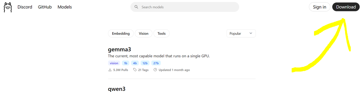 - ollama run gemma3 - сайт сразу предлагает команду установки (run проверяет наличие модели перед запуском и, если ее нет, сам активирует pull);