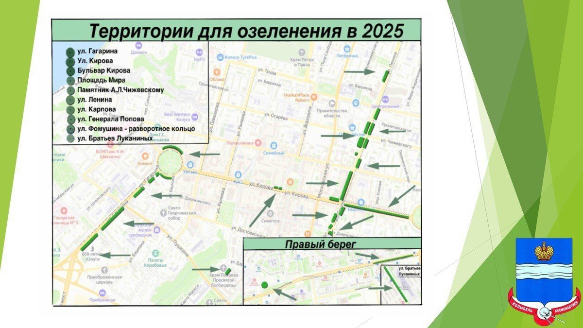 ▪️ В Калуге начались массовые посадки деревьев Компания, получившая контракт на озеленение Калуги, 21 мая приступила к работе. Начала она с улицы Ленина. Как сообщил городской голова Дмитрий Денисов, сейчас готовят к посадке деревьев площадку у магазина «Кругозор». После того, как работа на улице Ленина будет завершена, начнется озеленение улицы Гагарина. Как сообщила главный садовник Калуги Ольга Зорякова, помимо улиц Ленина и Гагарина в этом году планируется озеленить улицы Кирова, Карпова, Генерала Попова, Братьев Луканиных, разворотное кольцо на улице Фомушина, площадь Мира, территорию у памятника Чижевского. На этой неделе также будут высажены 50 кустов венгерской сирени на Сиреневом бульваре.