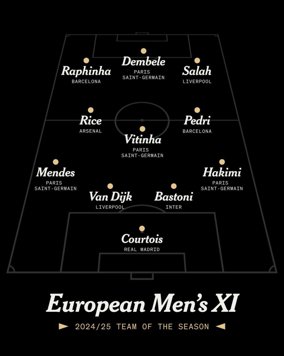 🔝 Футболисты шести клубов вошли в символическую сборную сезона-2024/25 по версии портала The Athletic