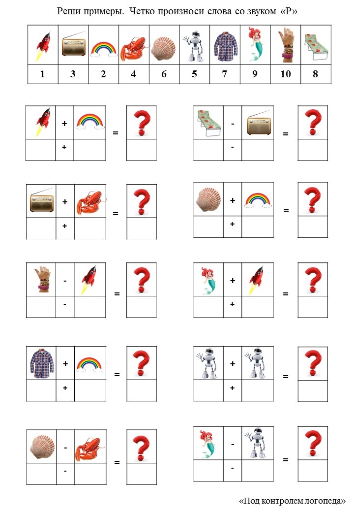 Реши примеры, четко произноси звук "Р" в словах.