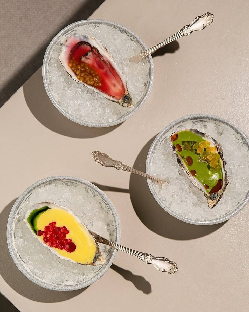 #Петербург #Анонс Делаем перерыв на устрицы и тартар в ресторане Futurist — изысканные и очень красивые новинки: •Устрицы с кремом из базилика и лимонным желе (650₽) / с гаспаччо из желтых томатов и жемчугом из красного лука (650₽); •Трюфельный тартар со шпинатом и муссом из пармезана (850₽); •Палтус с цукини и копченым сливочным муссом (1290₽). Барочная ул., 6