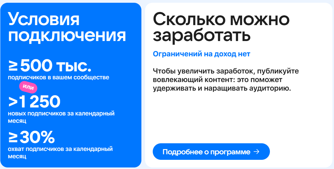 Начинаем зарабатывать. VK предоставляет администраторам сообществ возможность монетизировать свою аудиторию через партнерскую программу. Это отличный способ превратить активность подписчиков в доход. Однако для участия важно соответствовать ряду требований. Условия Чтобы подать заявку на монетизацию, ваше сообщество должно соответствовать критериям: Сообщество открытое. Сообщество создано не менее трех месяцев назад. В публикациях и описании отсутствует нецензурная лексика. Сообщество не относится к спорной тематике (политика, религия, эротика и т.п.). Более 500 тысяч подписчиков в сообществе или прирост в 1 250 новых подписчиков за последний месяц. Охват подписчиков более 30% за месяц. То есть минимум треть аудитории должна видеть ваш контент. Как подключиться Перейдите в управление сообществом, раздел «Монетизация», «Партнерская программа». Проверьте, выполнены ли все условия (система покажет статус каждого критерия). Нажмите «Подать заявку». Заявка рассматривается администрацией VK