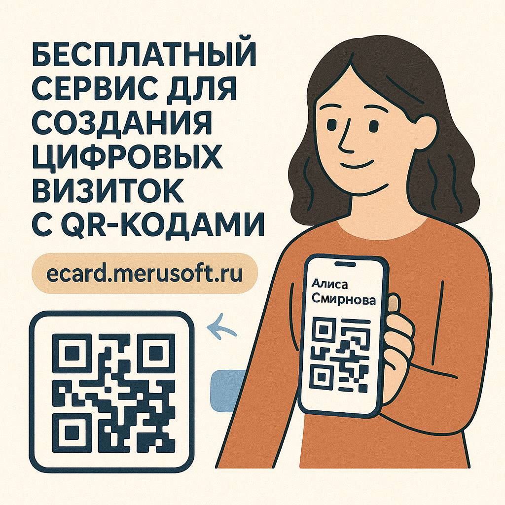 Создайте цифровую визитку с QR-кодом онлайн | Ecard.MeruSoft Удобный генератор виртуальных визиток с QR-кодом. Создайте уникальную электронную визитку за минуты. Бесплатные шаблоны, редактирование онлайн, экологичное решение! В эпоху цифровых технологий обмен контактами стал проще, быстрее и экологичнее. Цифровые визитки с QR-кодом — это современная альтернатива бумажным карточкам, которая экономит время и повышает эффективность связей. На платформе Ecard.MeruSoft вы можете создать профессиональную QR-визитку онлайн всего за несколько кликов. Почему цифровые визитки предпочтительнее? Бесконтактный обмен данными Просто отсканируйте QR-код для контактов, и ваши данные мгновенно сохранятся в телефон собеседника. Никаких потерянных бумажек! Экологичность Откажитесь от бумажных визиток в пользу экологичных визиток. Это шаг к устойчивому развитию бизнеса. Динамическое редактирование Обновите информацию в визитке в любой момент — изменения отобразятся у всех, кто уже сохранил ваш QR-код. Умн
