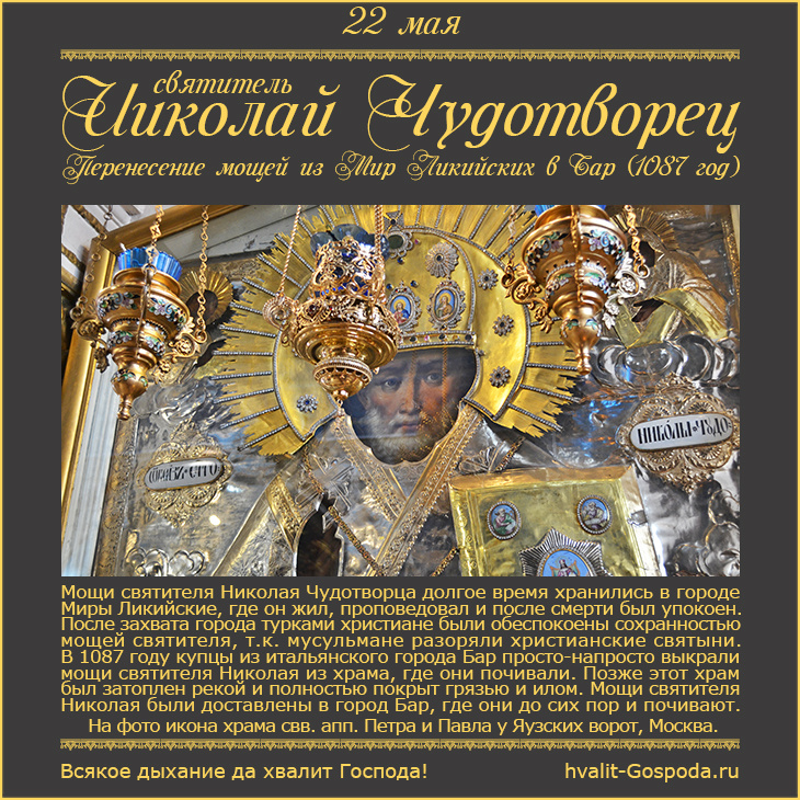 Мощи святителя Николая Чудотворца долгое время хранились в городе Миры Ликийские, где он жил, проповедовал и после смерти был упокоен. После захвата города турками христиане были обеспокоены сохранностью мощей святителя, т.к. мусульмане разоряли христианские святыни. В 1087 году купцы из итальянского города Бар просто-напросто выкрали мощи святителя Николая из храма, где они почивали. Позже этот храм был затоплен рекой и полностью покрыт грязью и илом. Мощи святителя Николая были доставлены в город Бар, где они до сих пор и почивают. На фото икона храма святых апостолов Петра и Павла у Яузских ворот, Москва. Тропарь святителю Николаю, архиепископу Мирликийскому, чудотворцу, глас 4 Приспе день светлаго торжества, град Барский радуется, и с ним вселенная вся ликовствует песньми и пеньми духовными: днесь бо священное торжество в пренесение честных и многоцелебных мощей святителя и чудотворца Николая, якоже солнце незаходимое, возсия светозарными лучами, разгоняя тьму искушений же и бед от