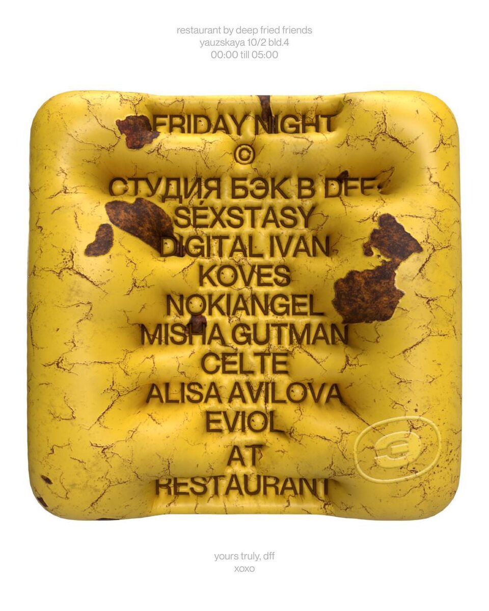 23 МАЯ 🅱️ СТУДИЯ БЭК в DFF! Лето начинается с танцев 💫 +23 на градуснике, ещё больше — на танцполе. В эту пятницу агентство БЭК возвращается в стены родного DFF, чтобы захватить задний двор и самое сердце клуба новой вечеринкой! Саунд — из самых танцующих глубин: Chicago house, TRAX Records, acid lines, jackin' grooves, tech-house, breaks и всё, что заставляет тело джэкать. В этот вечер мы отдадим честь рождению хауса — груву, ритму и телу. Jack your body — feel the sweat ⚡️ Line-up (по-настоящему жаркий): SÉXSTASY DIGITAL IVAN KOVES NOKIANGEL MISHA GUTMAN CELTE ALISA AVILOVA EVIOL 🎫 Вход платный от 700₽ На входе дороже FC/DC, 18+ 📆 23 мая, в 23:55 📍 Deep Fried Friends, Москва, ул. Яузская 10/2с4