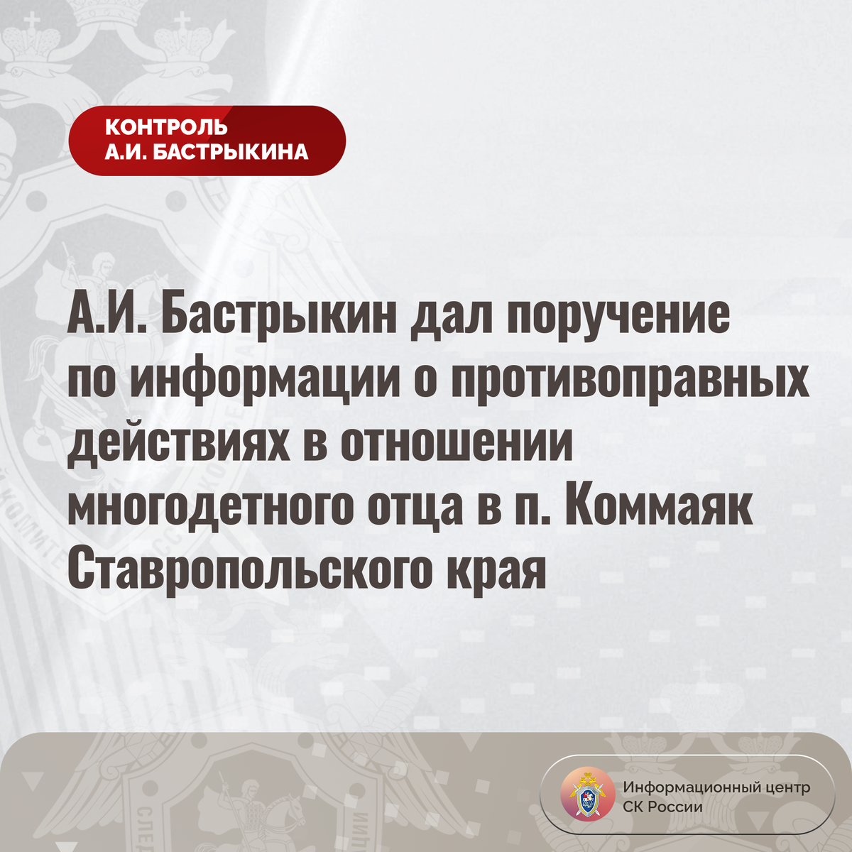 А.И. Бастрыкин дал поручение по информации о противоправных действиях в отношении многодетного отца в п. Коммаяк Ставропольского края