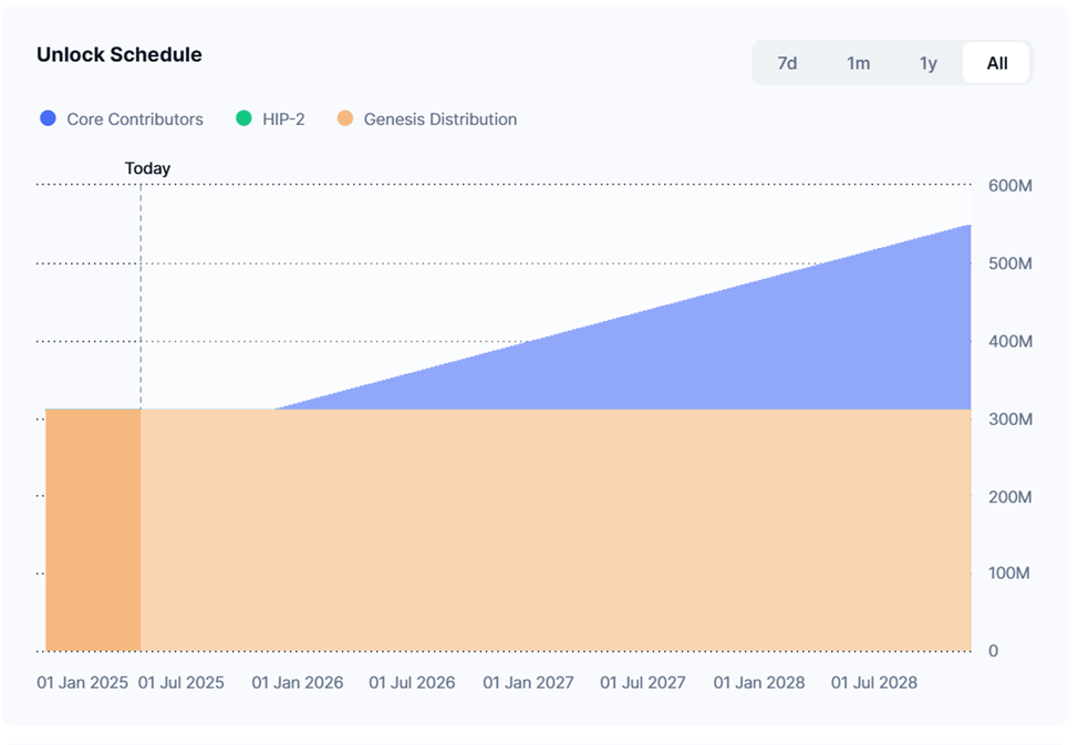 HYPE – нативный токен, и его можно стейкать. Доходность там плавающая, но весьма скромная, на текущий момент находится в диапазоне 2-2,5% годовых. Чем больше общее количество монет в стейке, тем меньше доходность. То есть, после разблокировок новых монет, велик риск получить доходность еще меньше.